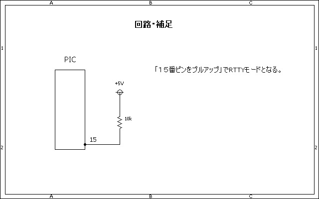 回路・補足「15番ピンをプルアップ」でRTTYモードとなります。(回路図に記載はなく、注意書きのみで触れられています。) |