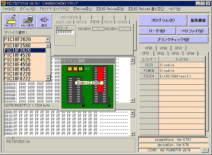 PICプログラマ使用するチップが"PIC18F2620"で比較的新しいものです。エレキーを作る時に購入した「AKI-PICプログラマV4」でも対応済みのようで一安心です。ファームウェア等は最新のものをダウンロード。 |