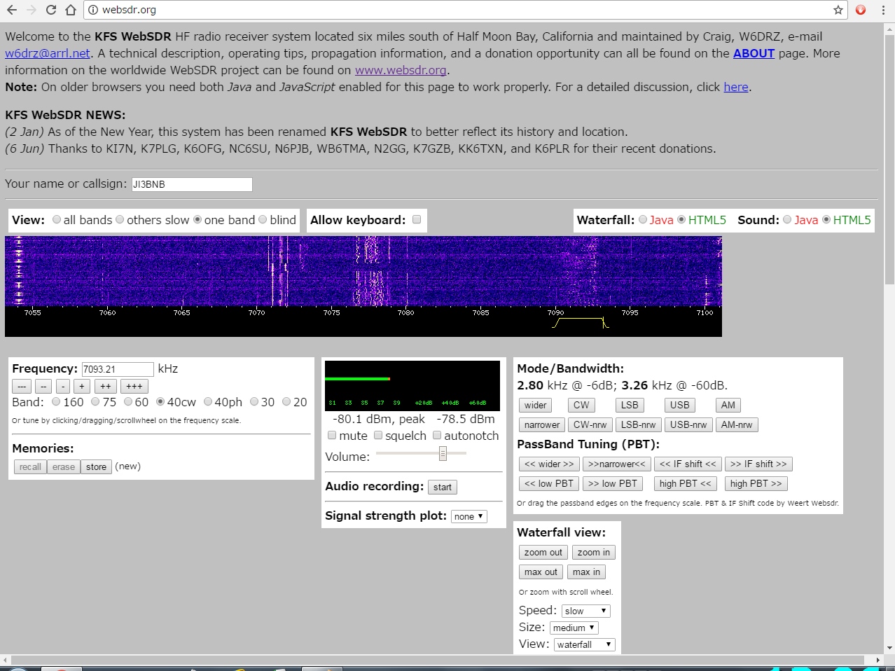 WebSDR"WebSDR"はインターネットを通じてSDR受信機を「世界でシェア」できるシステムです。 昔からある似たようなコンセプトのシステムと決定的に違うのは、複数のユーザーがそれぞれ別の周波数にチューンできる点でしょう。 特定ユーザーが延々と占有たり順番待ちが発生したりすることがありません。操作性も優れていてストレスがありません。 |