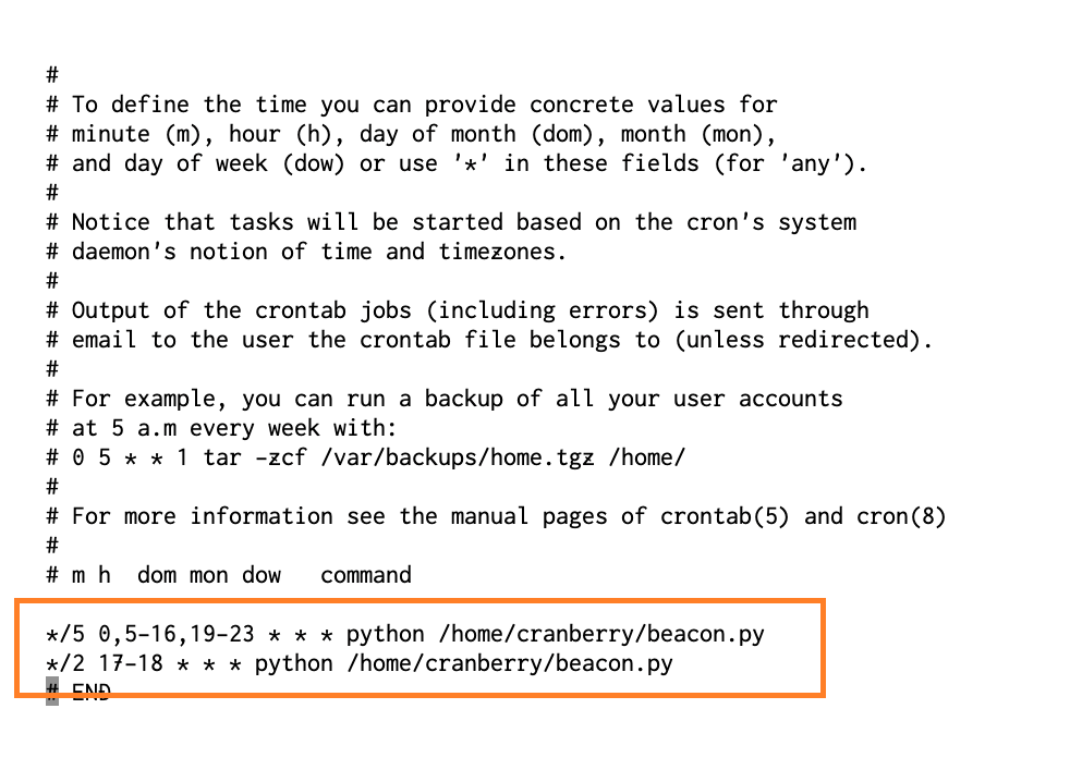 crontabの記述例左記の記述で「運用は早朝5時から深夜1時まで、17時台と18時台は2分間隔、その他は5分間隔の送信」となります。編集開始 - crontab -e |