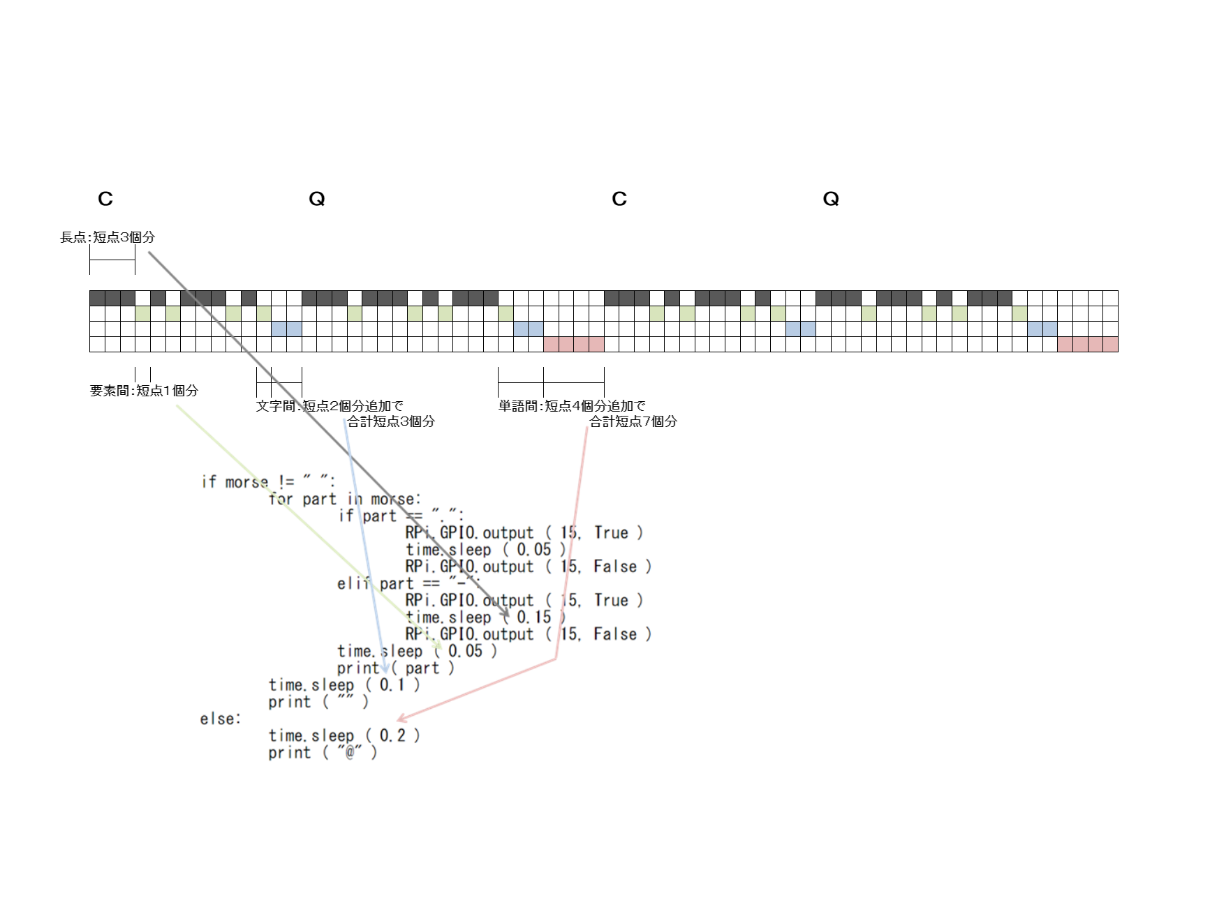 生成タイミングモールス符号は耳で習得しましたが、「感覚」ではプログラムができません。そこで正確なタイミングを復習してみました。単語間は短点7個分なんですね!初めて聞いた気がします(笑) |