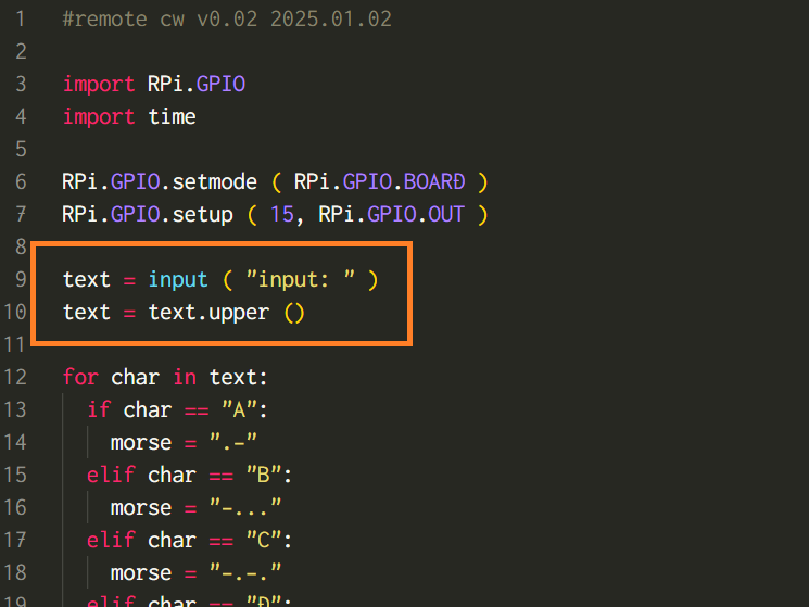 キーボード入力ほんの少しコードをいじってやるとキーボードからの入力に変更できます。SSH接続ならリモート運用も簡単に実現できますね。remote.py v0.04 2025.01.10 コマンドライン上での導入 - wget http://k183.bake-neko.net/ji3bnb/prog/remote.py 起動方法 - python remote.py 参考 - Enterキーを待たず逐次送信したい clkeyer011.py