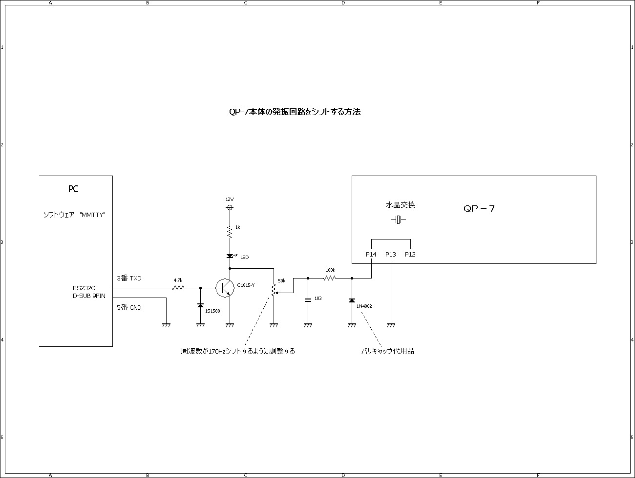 AQP-7本体の発振回路をシフトする方法P14とGND間にコンデンサをつなぐと周波数が下がる現象を利用します。QP-7本体の発信回路はピアスCBなのでVXOには向かない回路ですが、わずか170HzシフトするだけでOK!なのでこんな裏技も利用出来てしまいます。 |