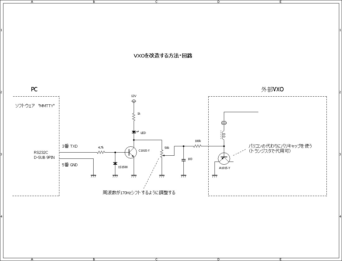 VXOを改造する方法・回路信号モニタを兼ねた反転回路を通しています。わずか170HzのシフトでOKですから、バリキャップの性能は問いません。 |