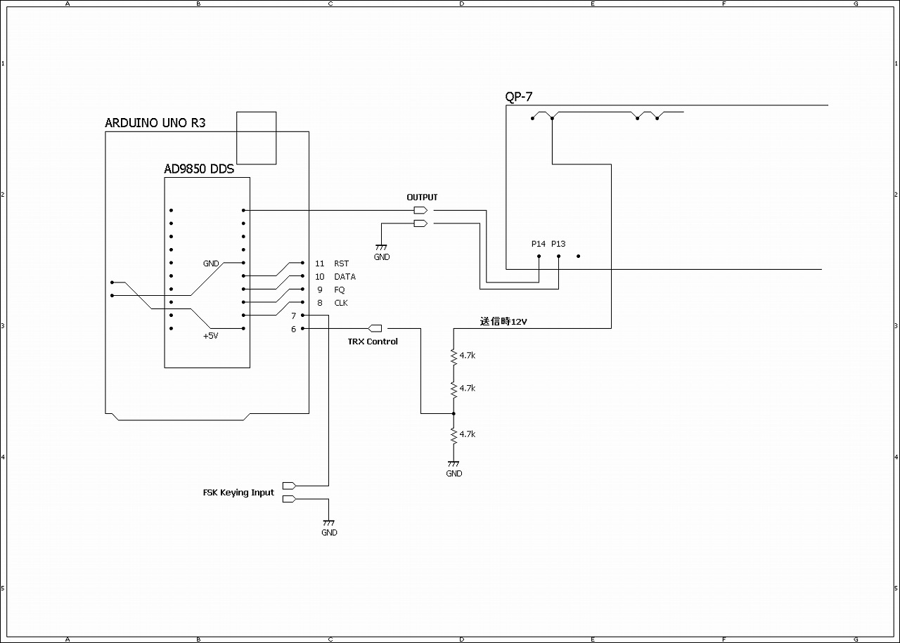 AD9850AD9850モジュールをArduino(UNO)でコントロールします。TTLレベルのFSK Keying入力を持ち、QP-7と組み合わせてRTTY送信機とします。 |
